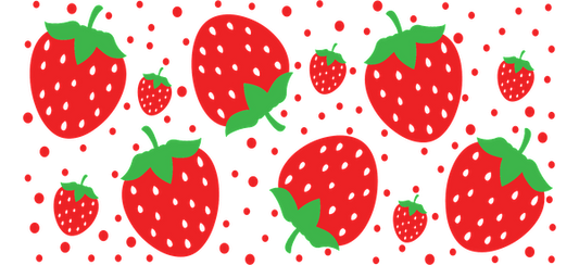 A playful pattern featuring vibrant red strawberries of various sizes, accented with green leaves, perfect for a summer theme.UV Transfers dtf prints