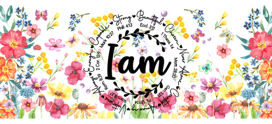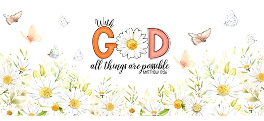 A black poster with flowers and butterflies surrounding the word "God".UV Transfers