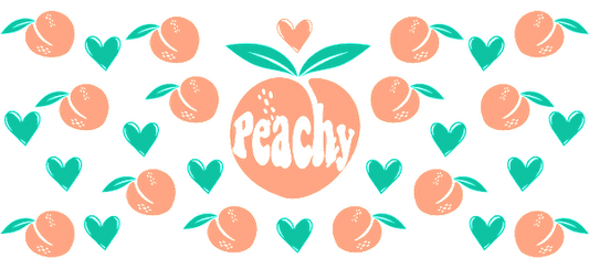 A green card with hearts and peaches and the word peachy.UV Transfers