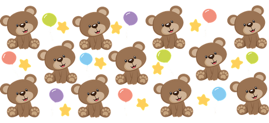 A cheerful pattern featuring cute brown teddy bears surrounded by colorful balloons and stars, perfect for a playful theme.UV Transfers dtf transfers