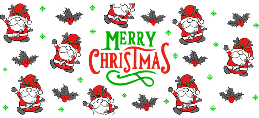 Festive Christmas pattern featuring cheerful Santa Claus illustrations and holly leaves, accented with a vibrant "Merry Christmas" message.UV Transfers dtf transfers