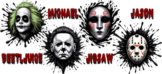 A vibrant graphic featuring iconic horror movie characters, including Beetlejuice, Michael Myers, Jigsaw, and Jason, with bold text highlights.UV Transfers dtf transfers