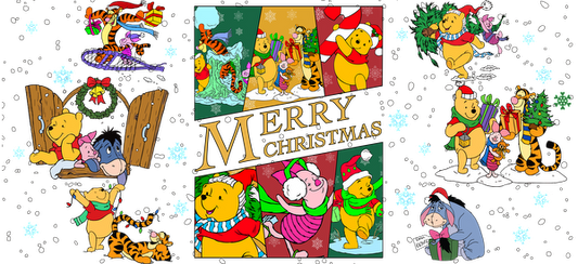 Celebrate the holidays with this whimsical Christmas collage featuring Winnie the Pooh and friends in festive attire and cheerful activities!UV Transfers heat press transfers