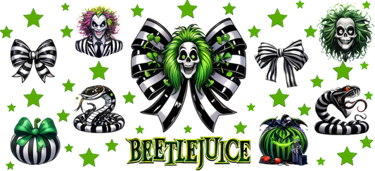 This vibrant Beetlejuice-themed design features quirky characters, black-and-white stripes, and green accents, perfect for fans of the classic film.UV Transfers