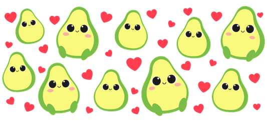 A cartoon pattern of cute avocados with hearts.UV Transfers