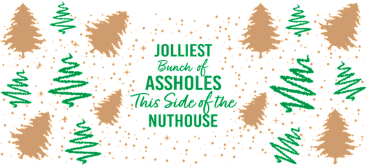 A playful holiday design featuring the phrase "Jolliest Bunch of Assholes This Side of the Muthouse," surrounded by festive trees.UV Transfersdtf regular iron