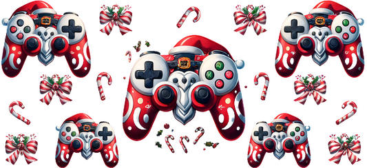 Festive video game controllers adorned with Santa hats, candy canes, and bows, perfect for holiday gaming sessions!UV Transfers heat press transfers