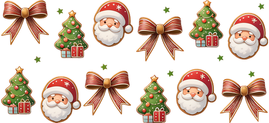 A cheerful collection of Christmas-themed icons featuring Santa faces, festive trees, and decorative bows in vibrant colors.UV Transfers dtf prints