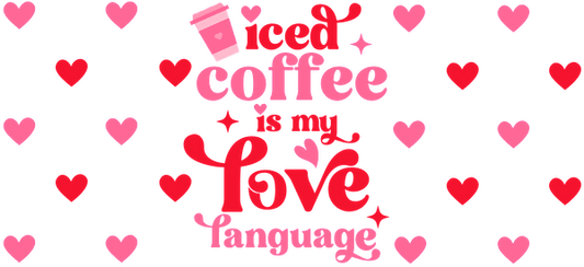 Pink on teal coffee blanket features a pun on love language.UV Transfers