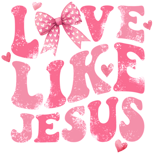 A vibrant pink graphic that reads "Love Like Jesus," adorned with a cute heart-patterned bow, promoting kindness and compassion.DTF Transfers