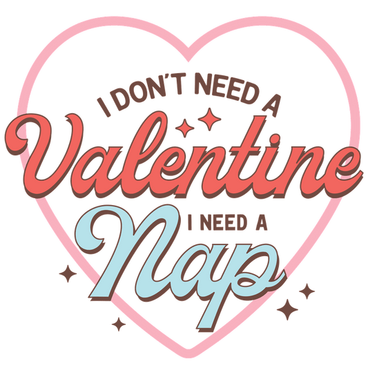 Playful design featuring the phrase "I don't need a Valentine, I need a nap" in a heart shape, ideal for nap lovers!DTF Transfers