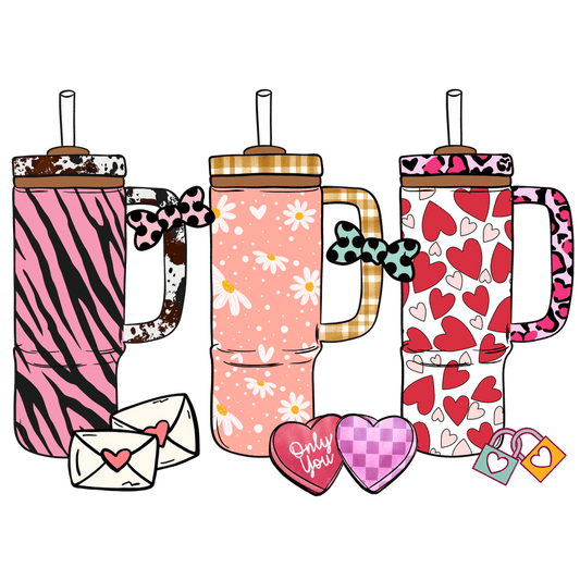 Three colorful mugs with unique heart and floral designs.DTF Transfers