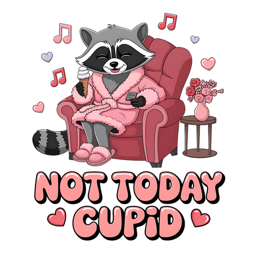 This playful illustration features a cozy raccoon in a pink robe and slippers, enjoying ice cream while seated in an armchair, with a whimsical "Not Today Cupid" slogan.DTF Transfers
