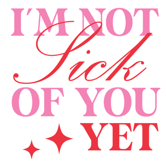 A playful and colorful graphic that reads, "I'M NOT Sick OF YOU YET," featuring vibrant pink and red lettering with sparkling accents.DTF Transfers