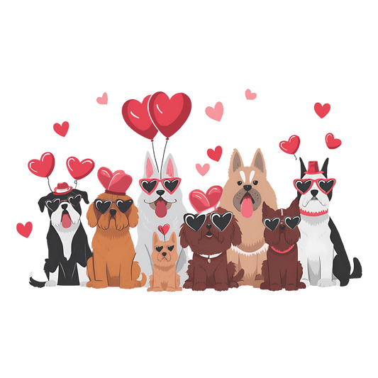 Cute dogs wearing heart-shaped sunglasses surrounded by hearts.DTF Transfers