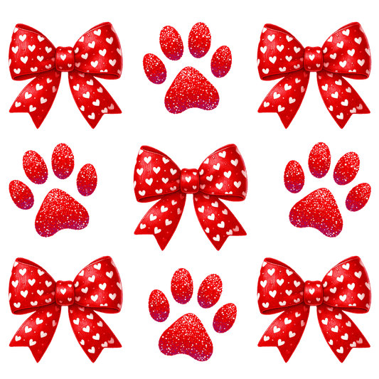 A vibrant pattern featuring red bows and paw prints with white hearts, perfect for celebrating love and pets!DTF Transfers