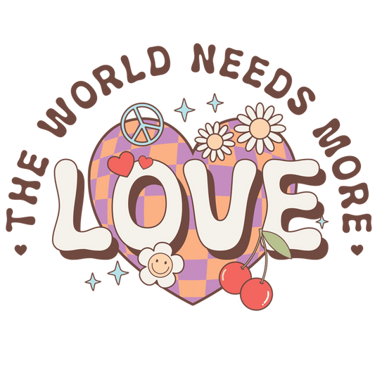 A vibrant illustration promoting positivity, featuring a heart design with flowers, cherries, and the message "The World Needs More Love."DTF Transfers