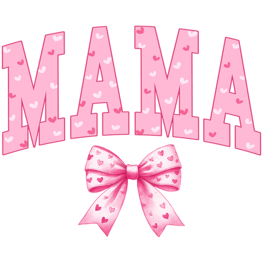 A vibrant and playful design featuring the word "MAMA" in pink letters adorned with hearts and a cute bow.DTF Transfers