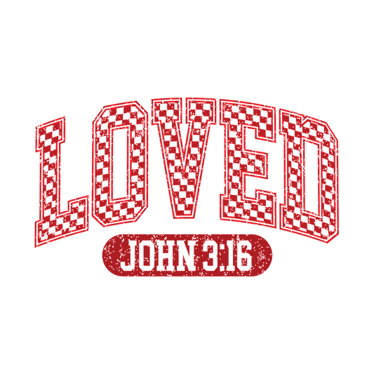 A bold red graphic featuring the word "LOVED" in an arched style, accompanied by "JOHN 3:16" in a central banner.DTF Transfers