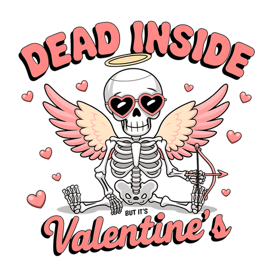 A playful Valentine’s design featuring a whimsical skeleton with angel wings, holding a bow and arrow, saying "Dead Inside."DTF Transfers