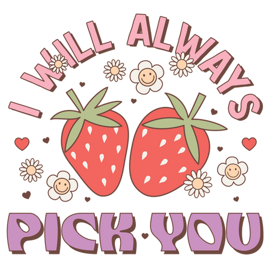 Regular price From £0.75 GBPRegular priceUnit price / per£2.40 GBPSale price From £0.75 GBPA whimsical illustration featuring two strawberries surrounded by cheerful flowers and the playful text, "I Will Always Pick You."DTF Transfers