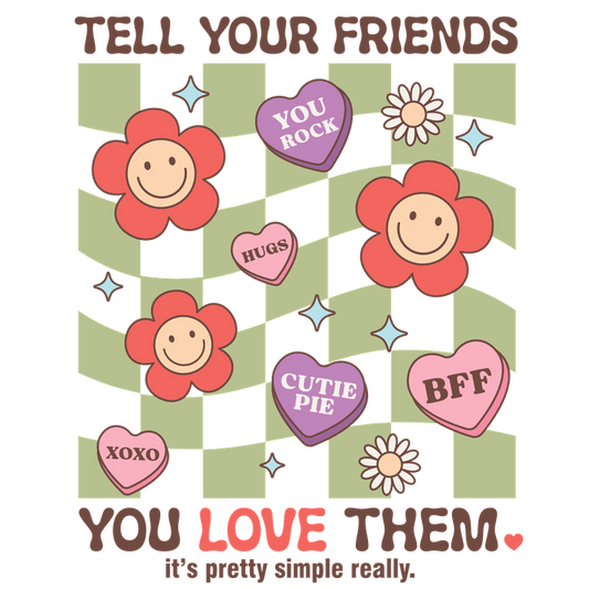 A cheerful graphic encouraging friendship and love, featuring smiling flowers and heart-shaped messages like "You Rock" and "BFF."DTF Transfers