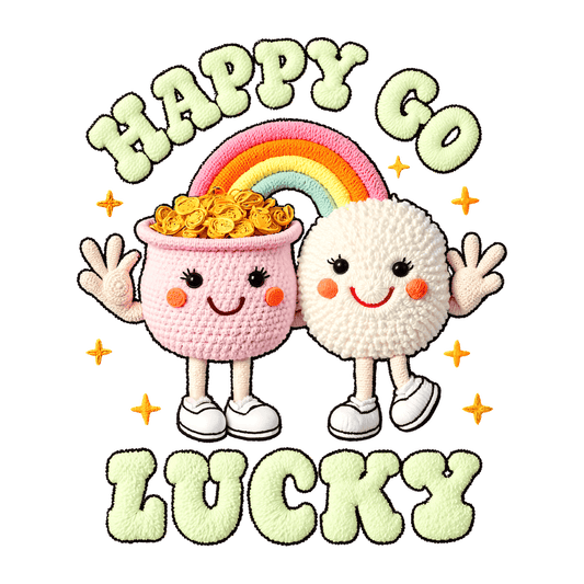 《3D chenille-like》Cute, colorful cartoon characters with the phrase "Happy Go Lucky."DTF Transfers
