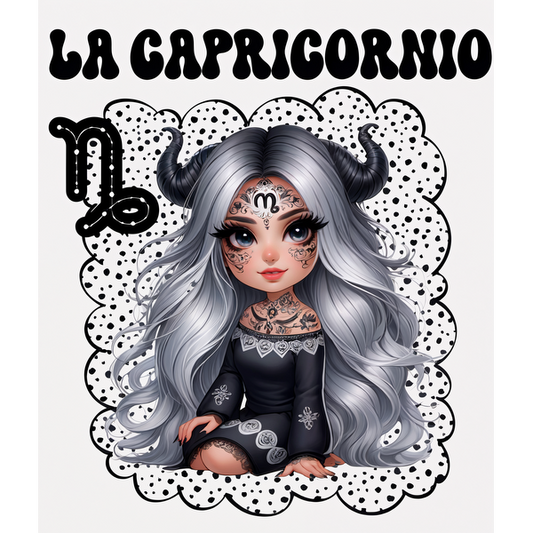 Una ilustración caprichosa de una niña con cabello largo plateado y detalles de cuernos, que presenta tatuajes intrincados y encarna el signo zodiacal de Capricornio.