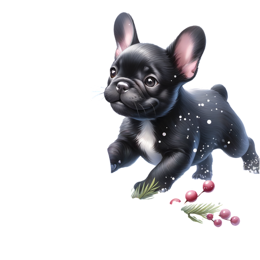 Un juguetón cachorro de bulldog francés negro rodeado de vegetación festiva, capturando el espíritu de alegría y diversión invernal.
