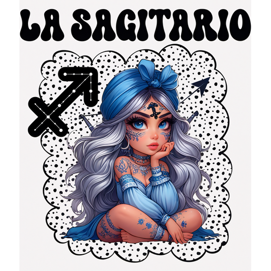 Una ilustración caprichosa de un personaje Sagitario con cabello largo plateado, adornado en azul, con tatuajes y símbolos astrológicos.