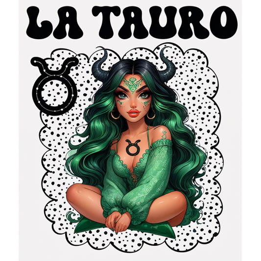 Una ilustración vibrante de una figura misteriosa con cabello y cuernos verdes, vestida con un traje verde fluido, que encarna el zodíaco Tauro.