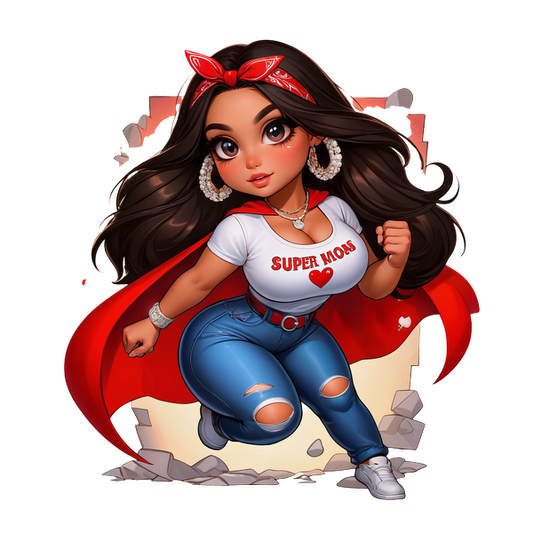 Una mamá superhéroe fuerte y elegante con una camiseta y jeans que dicen "SUPER MOM", una capa roja vibrante y un pañuelo.