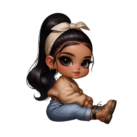 Precio habitual A partir de £0.75 GBPPrecio habitualPrecio unitario / por£2.39 GBPPrecio de oferta A partir de £0.75 GBPUn simpático personaje de dibujos animados con una cola de caballo, vestido con un suéter beige y jeans azul claro, posa elegantemente con una diadema de lazo.