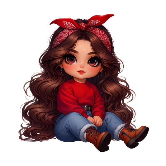Una linda chica de dibujos animados con cabello largo y ondulado, que viste un suéter rojo, jeans azules y botas marrones, y lleva un pañuelo como accesorio.