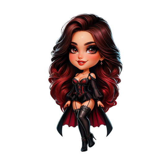 Un elegante personaje vampiro chibi con cabello largo rojo y negro, vestido con un corsé y medias hasta el muslo.