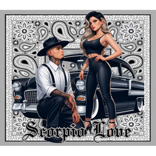 Precio habitual A partir de £0.75 GBPPrecio habitualPrecio unitario / por£2.39 GBPPrecio de oferta A partir de £0.75 GBPUna representación gráfica y elegante de una pareja que rezuma encanto vintage, con tatuajes atrevidos y atuendos clásicos sobre un fondo de autos clásicos.