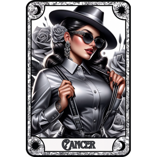 Una elegante ilustración de una mujer con una elegante camisa plateada y sombrero, adornada con rosas y gafas de sol, que representa a Cáncer.