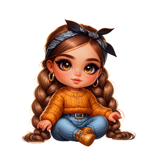 Una linda chica de dibujos animados con cabello trenzado, vestida con un suéter naranja y jeans azules, complementada con aretes de aro y un pañuelo.