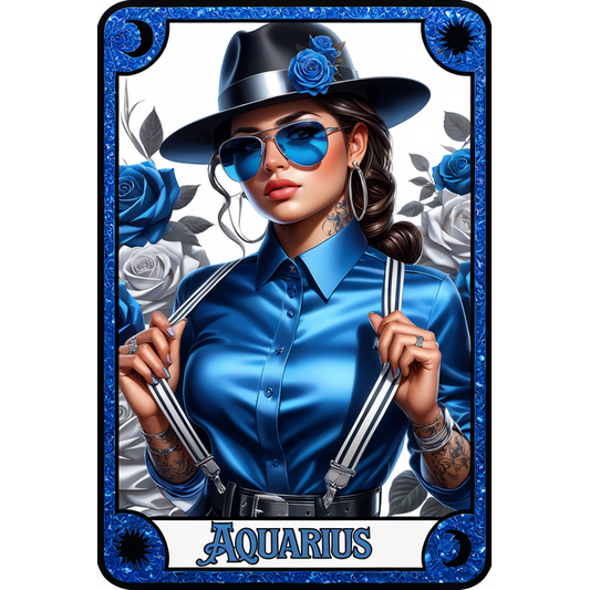 Una elegante ilustración con temática de Acuario que presenta a una mujer con una camisa azul, tirantes, gafas de sol y un sombrero adornado con rosas.