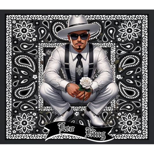 Una elegante ilustración de un hombre con traje blanco y sombrero, sosteniendo una rosa blanca sobre un atrevido fondo estampado en blanco y negro.