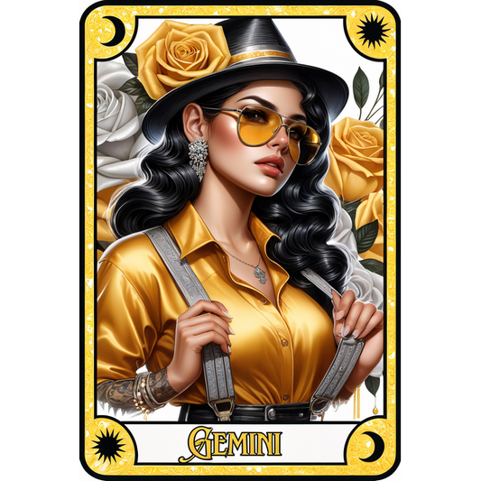 Precio habitual A partir de £0.75 GBPPrecio habitualPrecio unitario / por£2.39 GBPPrecio de oferta A partir de £0.75 GBPUna elegante ilustración de una mujer segura de sí misma, con cabello largo y negro, que viste una camisa amarilla y gafas de sol, y que representa el zodíaco Géminis.