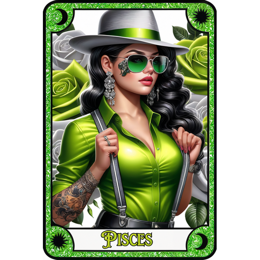 Precio habitual A partir de £0.75 GBPPrecio habitualPrecio unitario / por£2.39 GBPPrecio de oferta A partir de £0.75 GBPUna mujer elegante encarna el signo zodiacal de Piscis, vistiendo una camisa verde vibrante, tirantes plateados y un elegante sombrero de ala ancha.