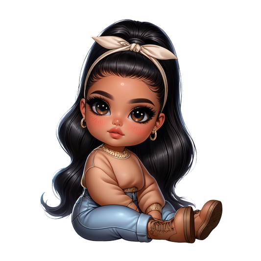 Una linda ilustración digital de una niña con cabello largo y oscuro, vistiendo un suéter acogedor y jeans elegantes.