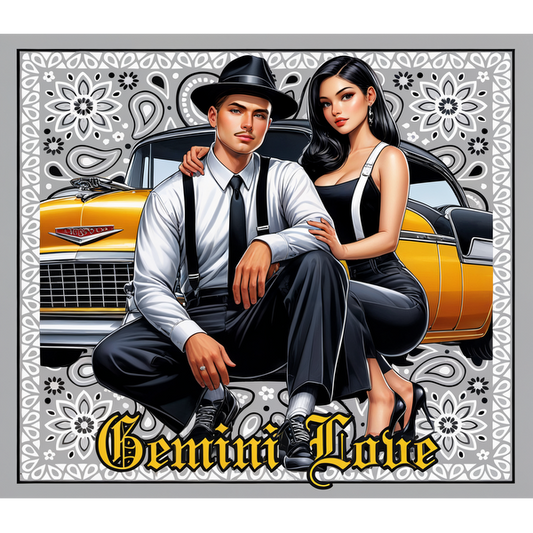 Una elegante pareja posa con un clásico automóvil amarillo, mostrando una mezcla de moda retro y amor bajo el tema "Gemini Love".