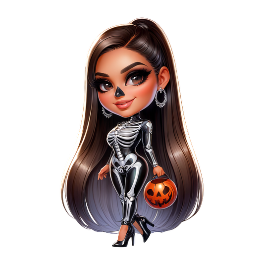 Una divertida ilustración con temática de Halloween que presenta una figura con cabeza de calabaza, medias de rejilla y detalles de telaraña.