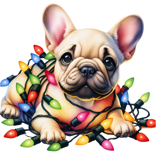 Un adorable Bulldog Francés juguetonamente enredado en coloridas luces navideñas, irradiando encanto y espíritu festivo.