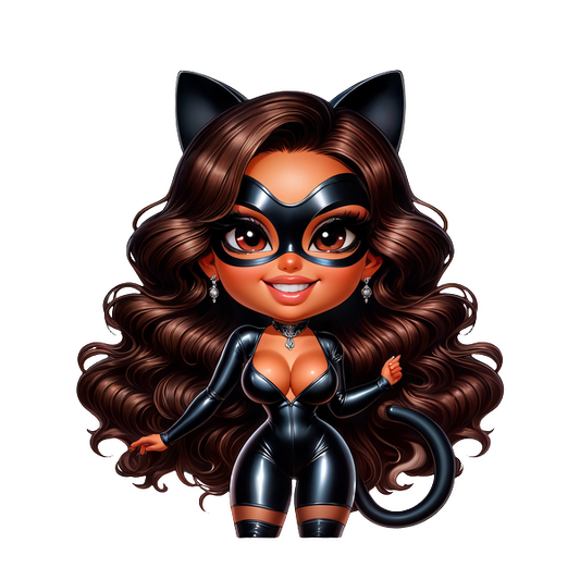 Precio habitual A partir de £0.75 GBPPrecio habitualPrecio unitario / por£2.39 GBPPrecio de oferta A partir de £0.75 GBPUn personaje juguetón, de estilo de dibujos animados, con un traje de gato negro con orejas de gato, cabello largo y rizado y una sonrisa encantadora.