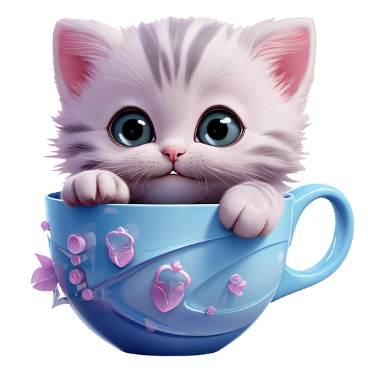 Precio habitual A partir de £0.75 GBPPrecio habitualPrecio unitario / por£2.39 GBPPrecio de oferta A partir de £0.75 GBPUn lindo y esponjoso gatito con ojos grandes se asoma desde una taza azul claro adornada con pequeñas decoraciones rosas.