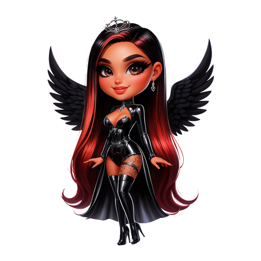 Precio habitual A partir de £0.75 GBPPrecio habitualPrecio unitario / por£2.39 GBPPrecio de oferta A partir de £0.75 GBPUn elegante personaje de dibujos animados con cabello largo de color rojo y negro, vestido con un elegante traje negro y adornado con alas angelicales.