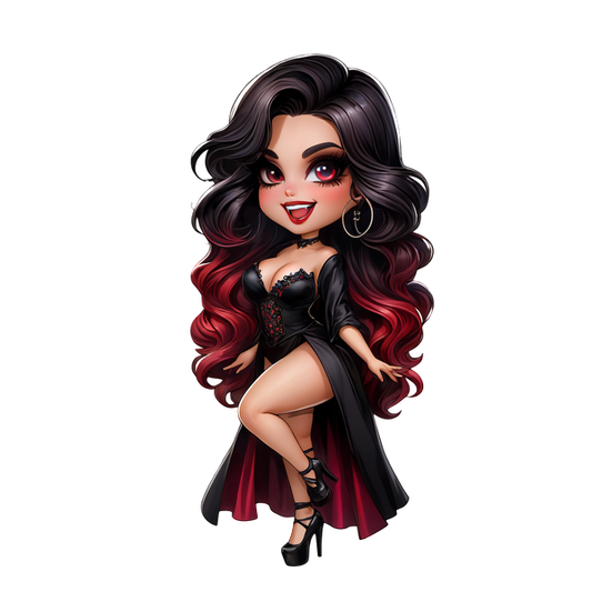 Este encantador personaje tiene cabello largo y ondulado con puntas rojas, viste un sensual vestido negro y elegantes accesorios.